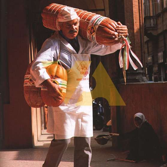 Фото 6: Название Mortadella как будто происходит от mortaio della carne di maiale — молотая свинина. Как бы там ни было, эта огромная колбаса может весить более 100 кг и должна быть нарезана очень тонко.