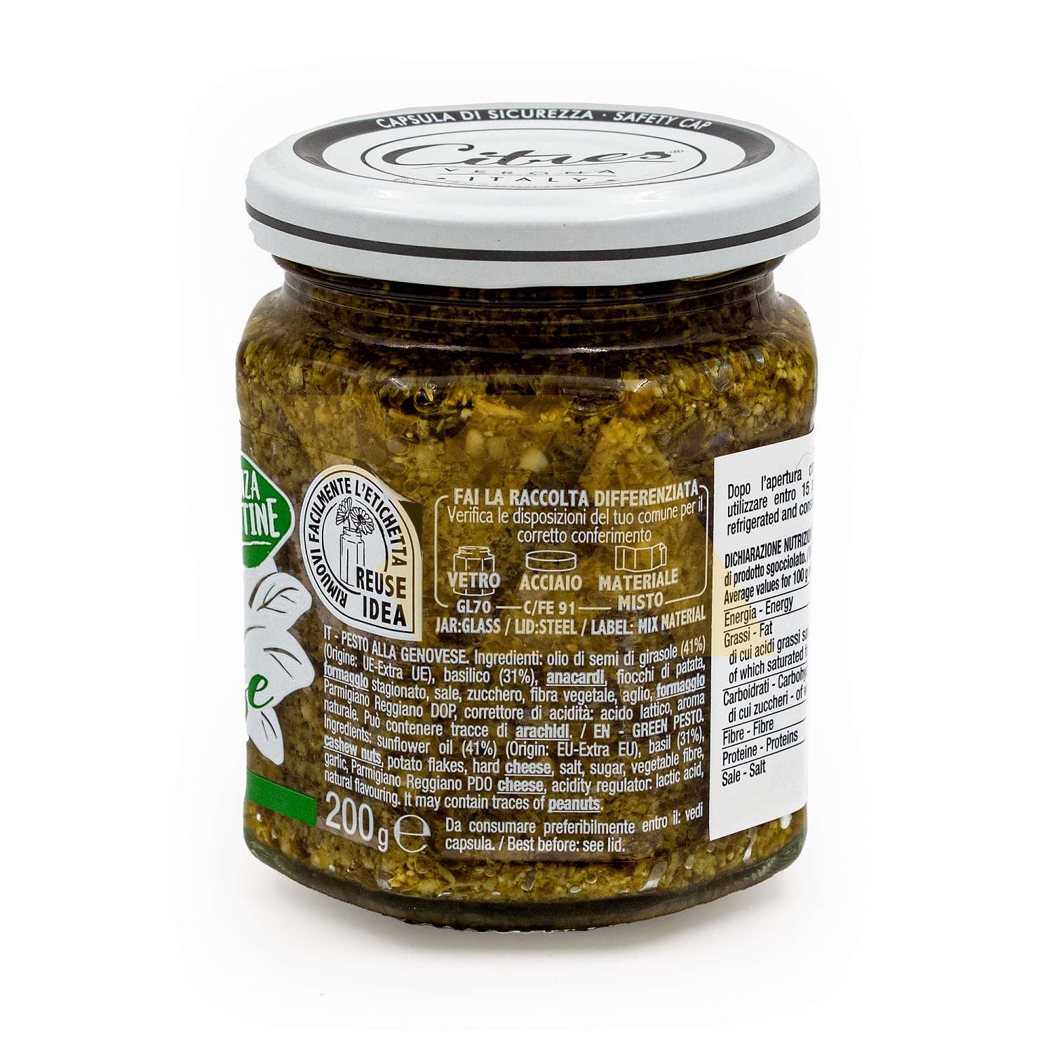 Подсолнечное масло 41%, базилик 31%, кешью, картофельные хлопья, выдержанный сыр, соль, сахар, растительное волокно, чеснок, сыр Пармиджано Реджано DOP, регулятор кислотности: молочная кислота, натуральный ароматизатор. Содержит орехи (кешью) и молочные продукты (сыр Пармиджано Реджано DOP и выдержанный сыр). Может содержать следы арахиса. Не содержит глютен.