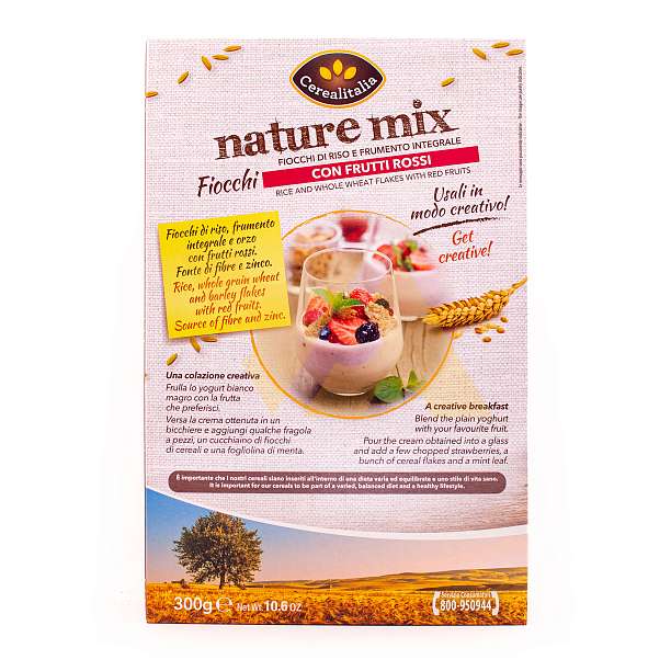 Рисовые хлопья, мука из неочищенного пшеничного зерна, ячмень с красными ягодами обогащенные 7 витаминами и железом. 100% итальянский рис и ячмень. Источник клетчатки. Не содержит красителей, пальмового масла, консервантов и ГМО. Упаковка содержит 10 порций по 30 гр.