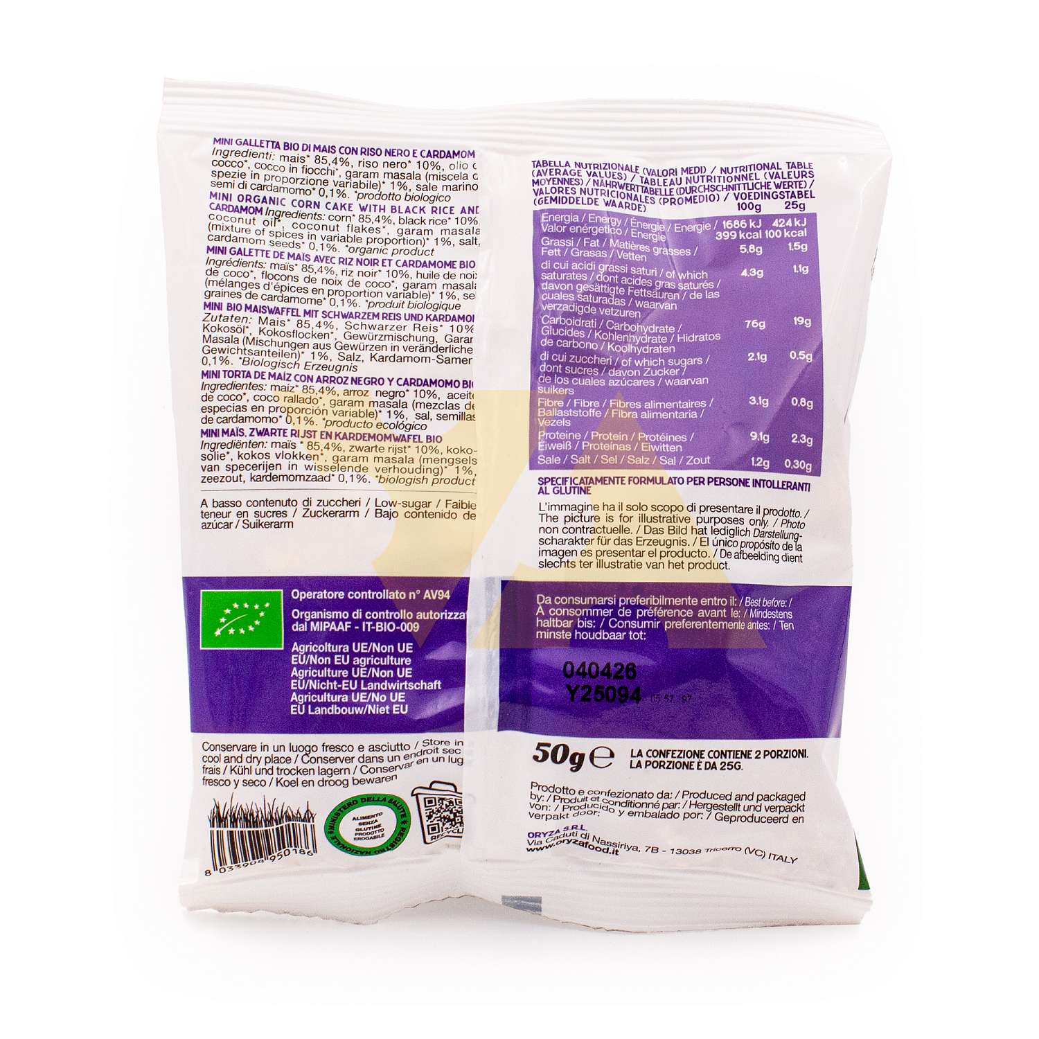 Продукт произведен на 100% из итальянской кукурузы и черного риса. Только натуральные специи. Не содержит ароматизаторов.