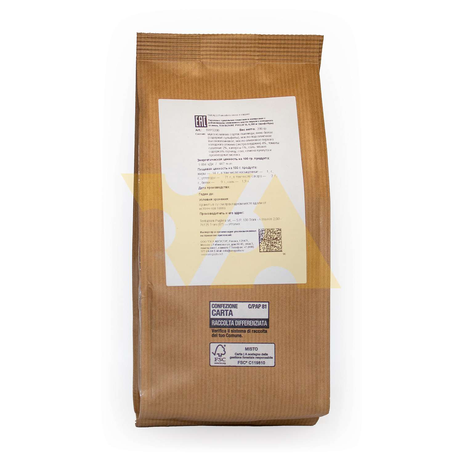 • Состав: мука из мягких сортов пшеницы, вино белое (содержит сульфиты), масло подсолнечное высокоолеиновое, масло оливковое первого холодного отжима (экстра верджин) 4%, томаты сушеные 2%, каперсы 1%, соль. Может содержать горчицу, сою, семена кунжута и производные молока.