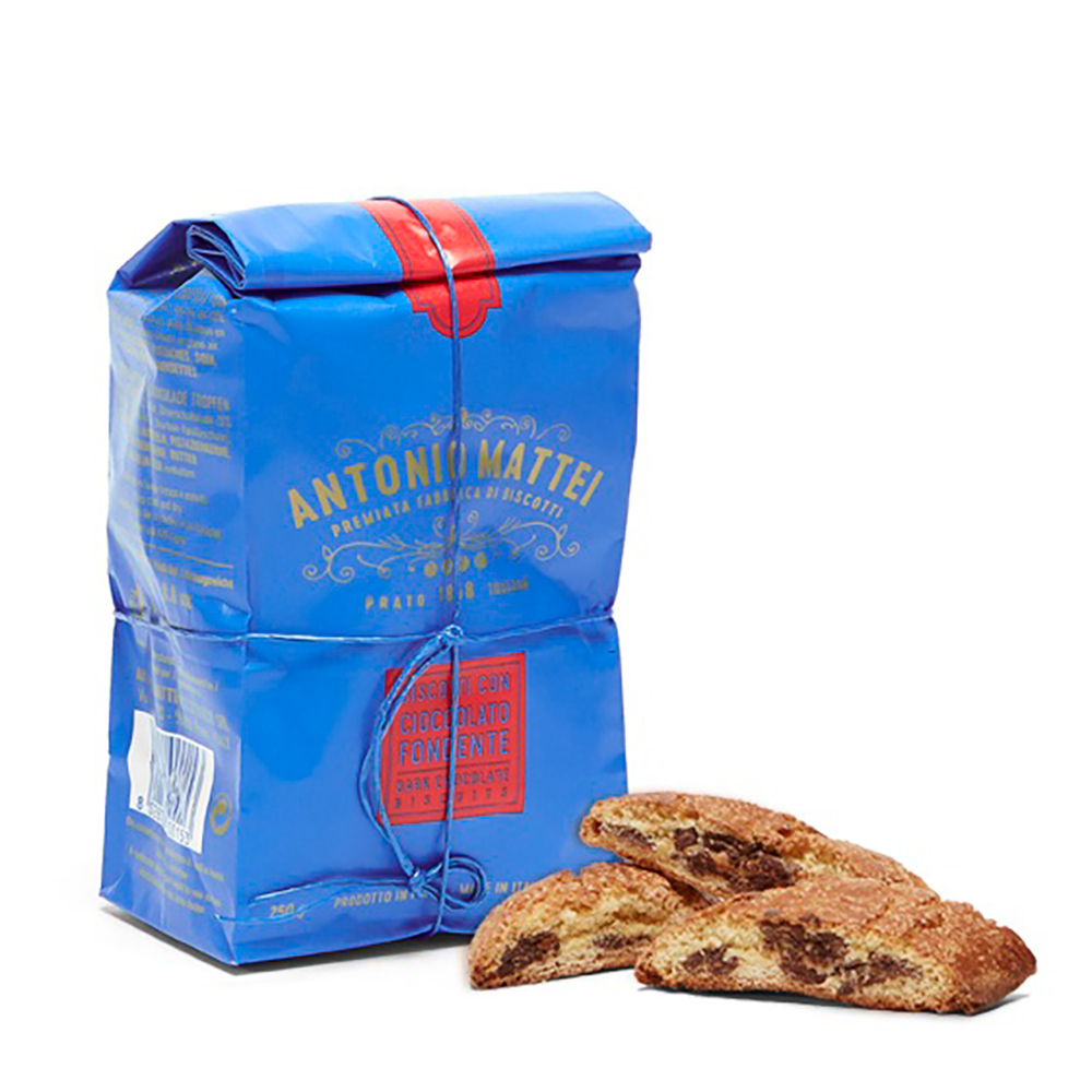 С 1858 года наши бискотти ежедневно выпекаются и вручную упаковываются по одному в классический синий пакет Маттеи. В 2013 году к традиционному рецепту бискотти ди Прато с миндалём добавился новый рецепт с каплями тёмного шоколада.