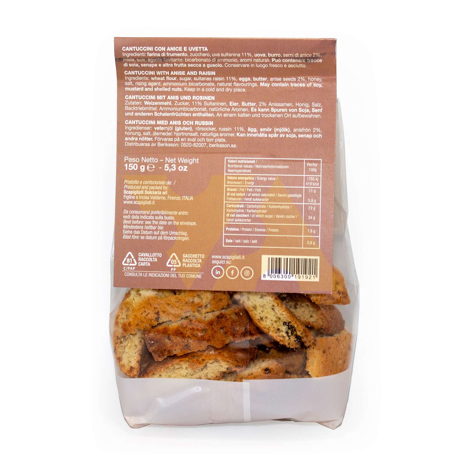 мука пшеничная, сахар, изюм 11%, яйца, масло сливочное, семена аниса 2%, мед, соль, разрыхлитель сухой: бикарбонад аммония, ароматизаторы натуральные. Может содержать остатки сои и других орехов.
