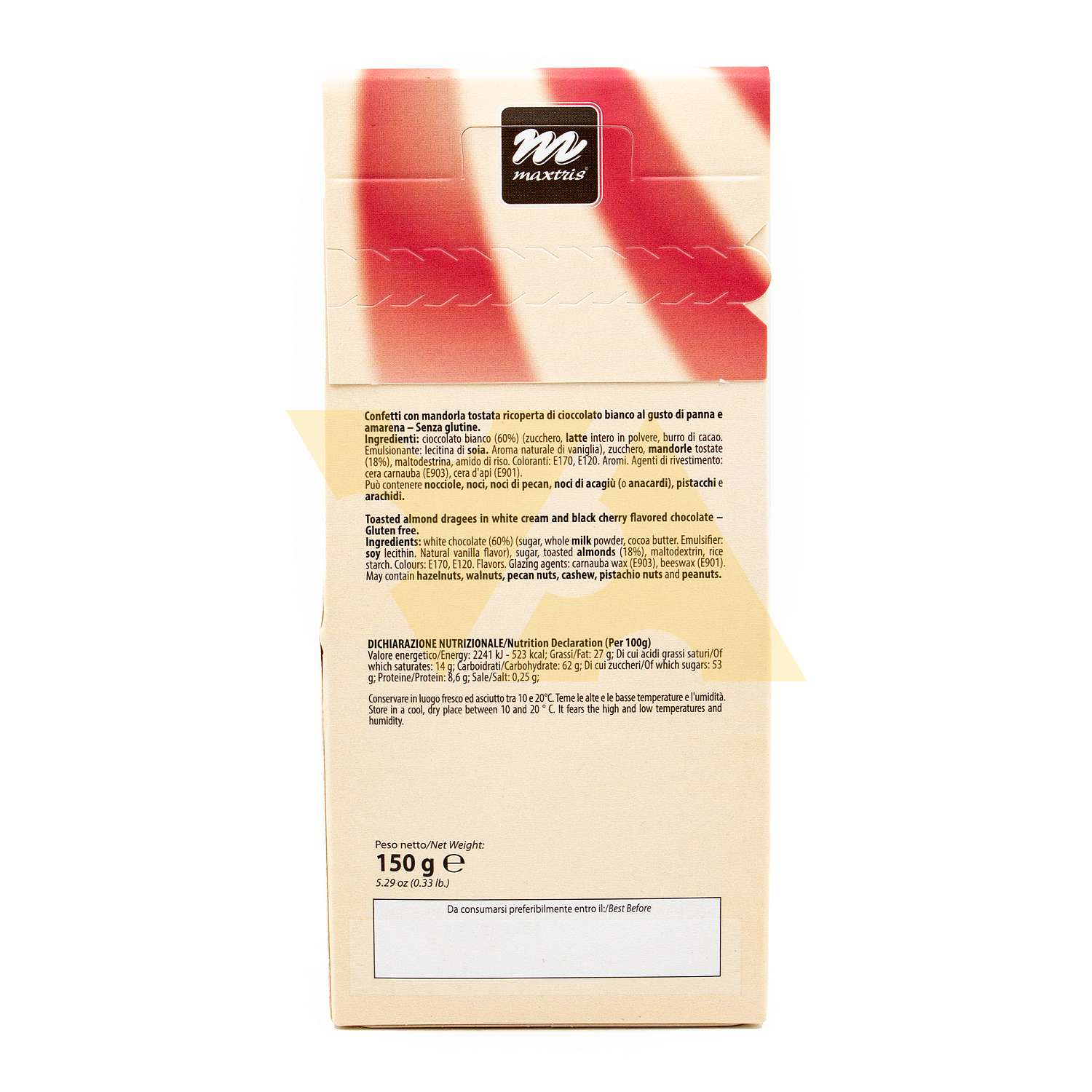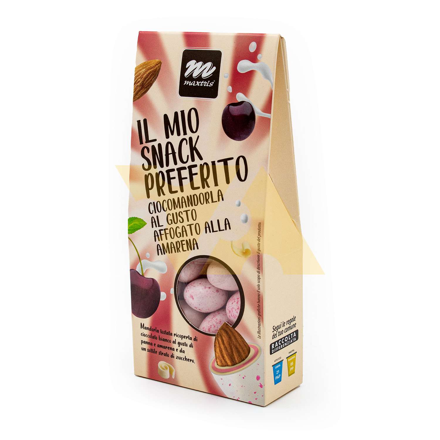 Обжаренный миндаль, покрытый белым шоколадом со вкусом сливок и вишни амарена, и тонким слоем сахара.