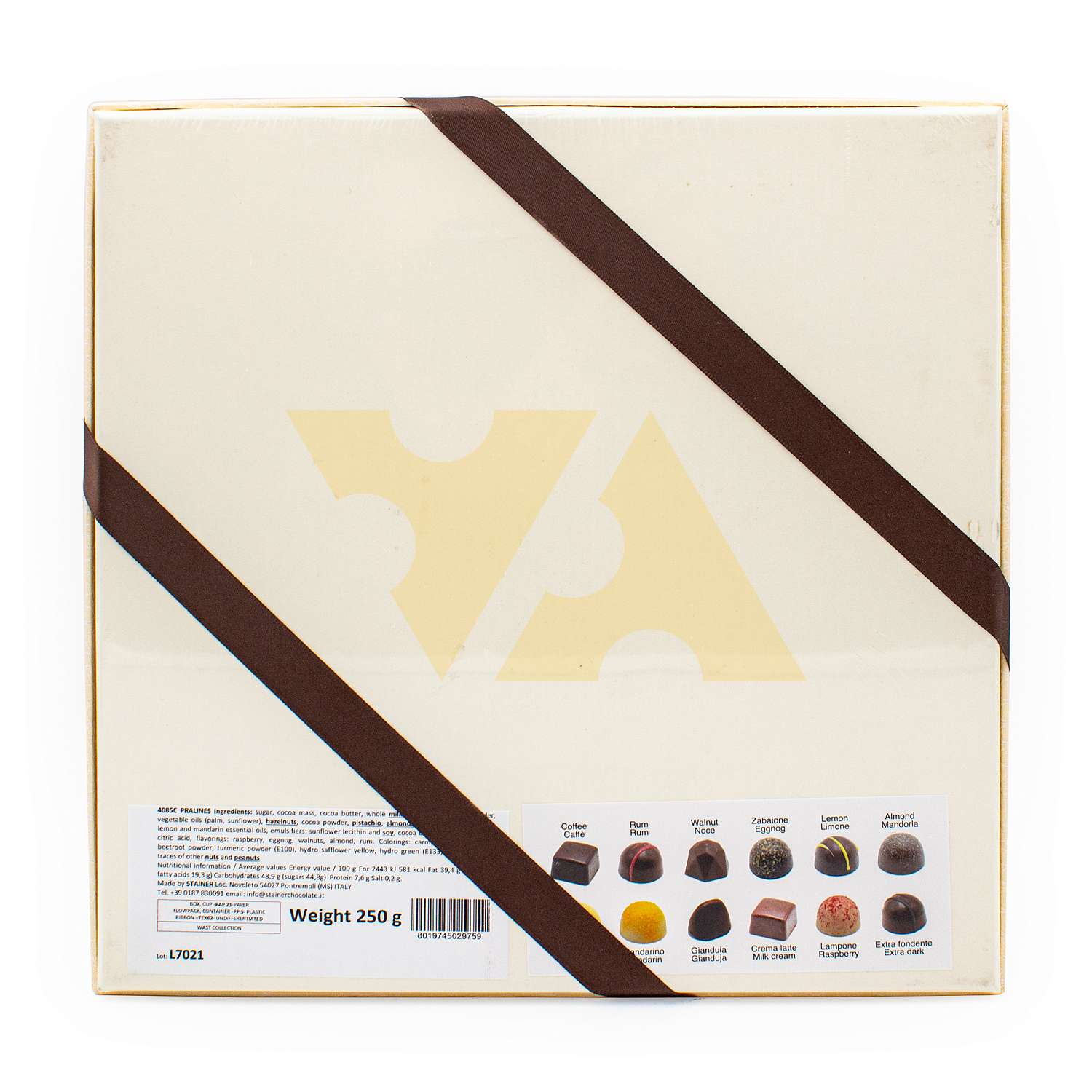 сахар, какао паста, какао масло, молоко цельное сухое и сливки молочные сухие, масла растительные (пальмовое, подсолнечное), грецкий орех, какао-порошок, фисташки, миндаль, кофейный порошок, лактоза, лимонная и мандариновая экссенция, эмульгатор: подсолнечный и соевый лецитин, зерна какао, регулятор кислотности: лимонная кислота, ароматизаторы: малина, сабайон, грецкий орех, миндаль, ром. Красители: карминовая пудра (Е120), свекольная пудра, турмериковая пудра (Е100), желтый гилро сафлор, зеленый краситель (Е133). Может содержать остатки других орехов и арахиса.