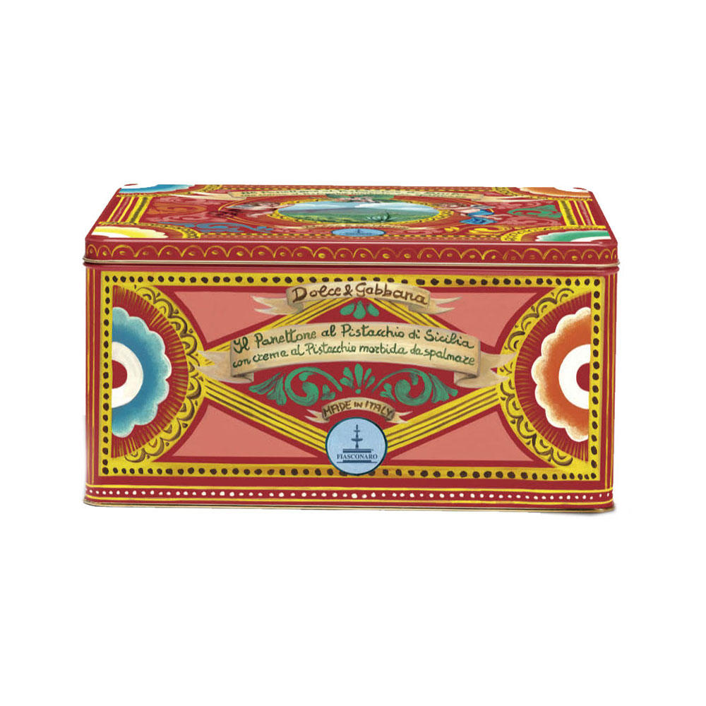 Подлинная классика кондитерского дома Fiasconaro. Панеттоне покрыт белым шоколадом и фисташками, а в комплекте идёт баночка с нежнейшим кремом из сицилийской фисташки, который можно намазывать на ломтики прилагающимся позолоченным ножом.