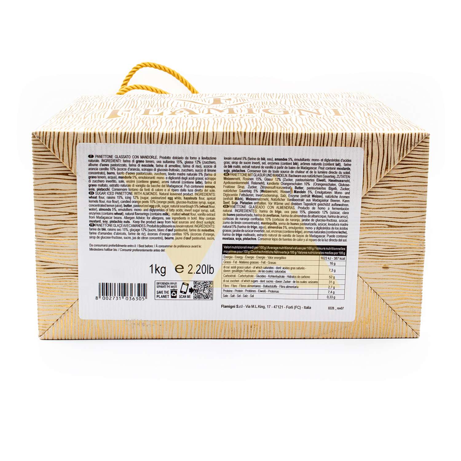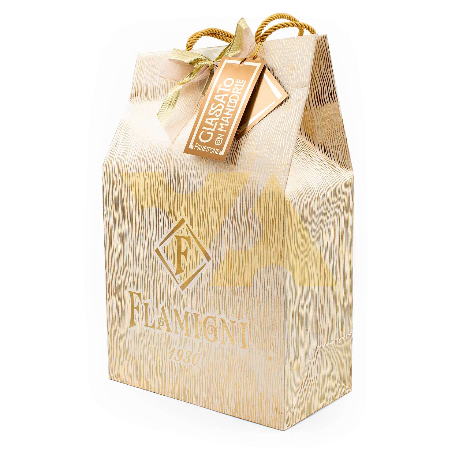 Панеттоне "Глазированный с миндалем" от Flamigni готовится по уже столетнему пьемонтскому рецепту, который предполагает низкую форму и хрупкую глазурь, покрытую дождём из миндаля.