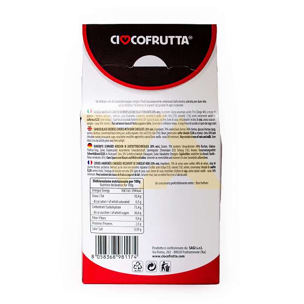 вишня засахаренная 70% (вишня 48%, сироп глюкозы-фруктозы, сахароза, декстроза, вишневый сок концентрированный, регулятор кислотности: лимонная кислота Е330, краситель Е163, ароматизаторы, консервант: анидрид сольфорозы Е220). Покрытие из темного шоколада 30% (паста какао, сахар, масло какао. Эмульгатор: соевый лецитин, ароматизатор: натуральная ваниль. Какао минимум 56%). Может содержать остатки орехов и молока.