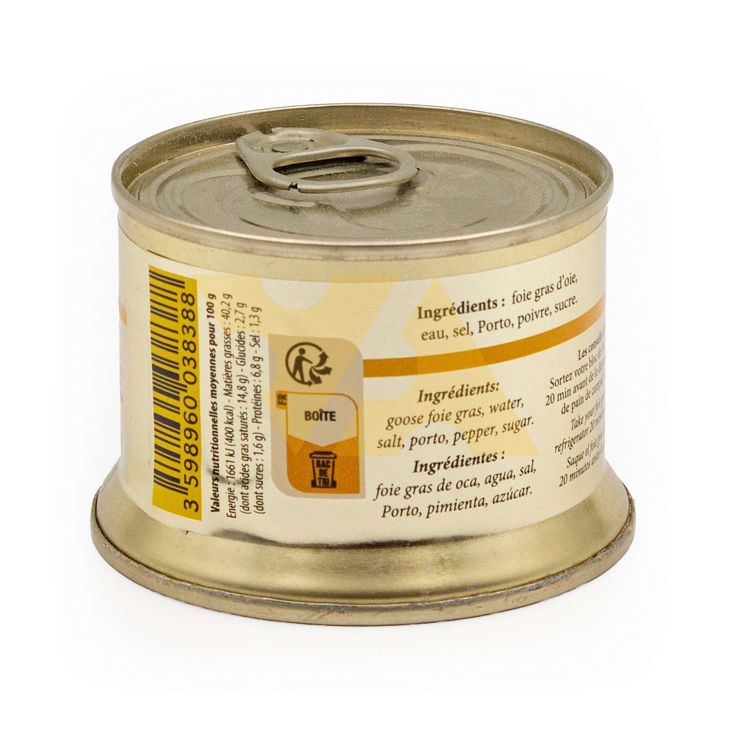 Фуа-гра (печень гусиная), вода, соль, портвейн, перец, сахар. Не содержит ГМО.