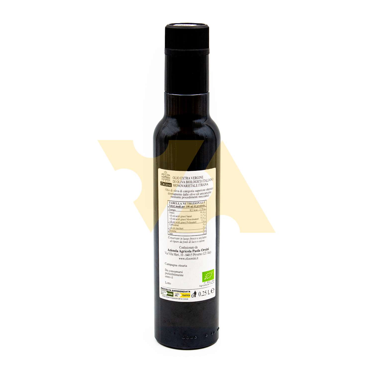 Оливковое масло «Резерв Паолы Орсини» — это сложное и элегантное масло. Высочайшего качества, оно получается исключительно путем холодного отжима оливок МОНОСОРТА ITRANA, собранных в оливковой роще с видом на Понтийские острова. Интенсивного зеленого цвета, с очень низкой кислотностью, богатое терапевтическими свойствами, оно характеризуется наличием полезных антиоксидантов. Особое географическое положение, где находятся оливковые деревья, характеризующееся влиянием морского воздуха, каменистой структурой почвы, высотой над уровнем моря, а также чрезвычайной заботой и вниманием, уделяемыми процессу производства и переработки, определяют качество этого масла, которое добилось важных результатов на престижных оливковых конкурсах.
