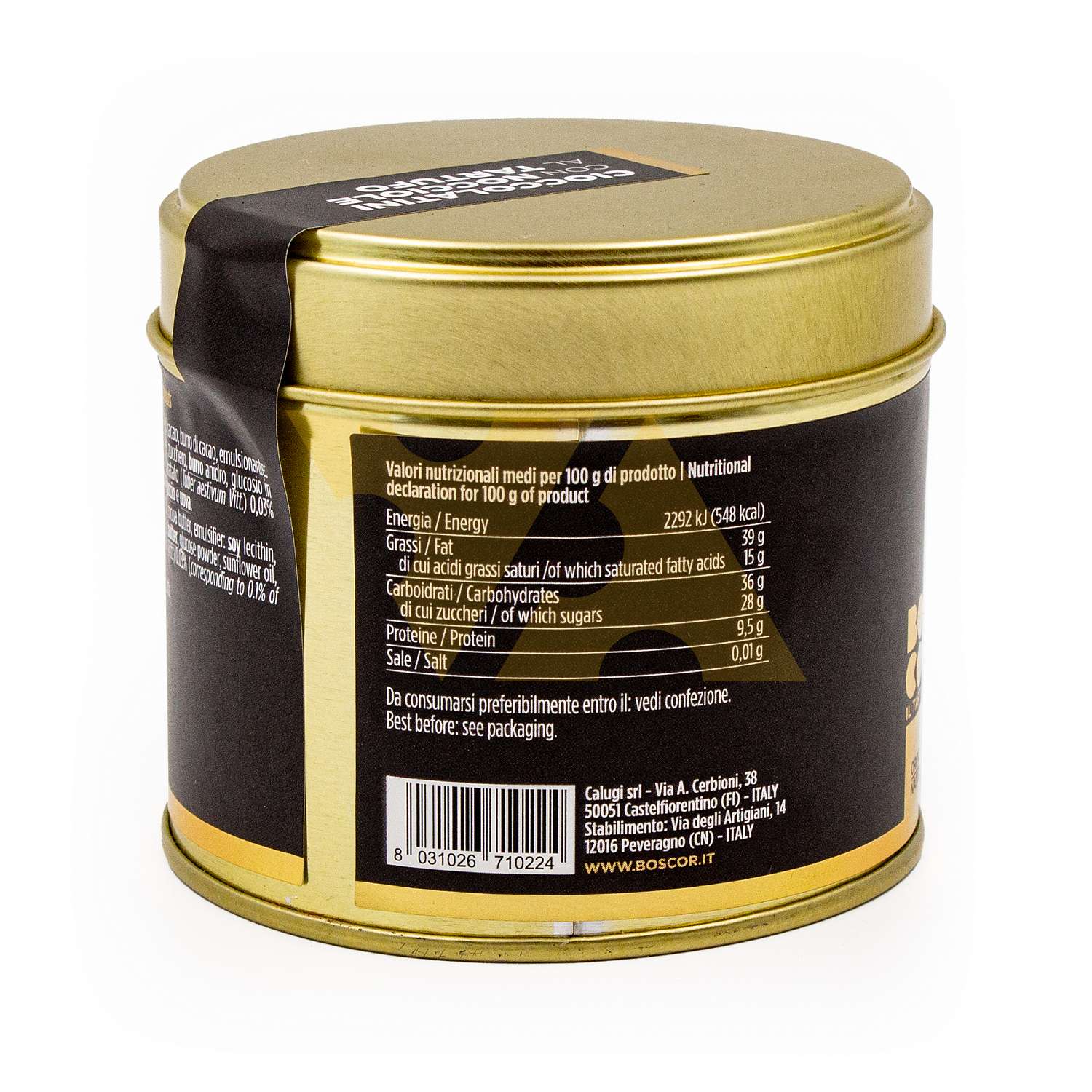 шоколад темный 60% какао мин. (сахар, паста какао, масло какао, эмульгатор: соевый лецитин, ваниль), фундук 35%, какао обезжиренное сухое, сахар, масло сливочное анидрированное, глюкоза сухая, масло подсолнечное, соль, ароматизатор, Трюфель черный летний (Tuber aestivum Vitt.) 0,3% (в продукт используется 100 гр. свежего трюфеля). Может содержать орехи и яйца.