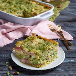 Лазанья из хлеба карасау с песто из цуккини и мортаделлой