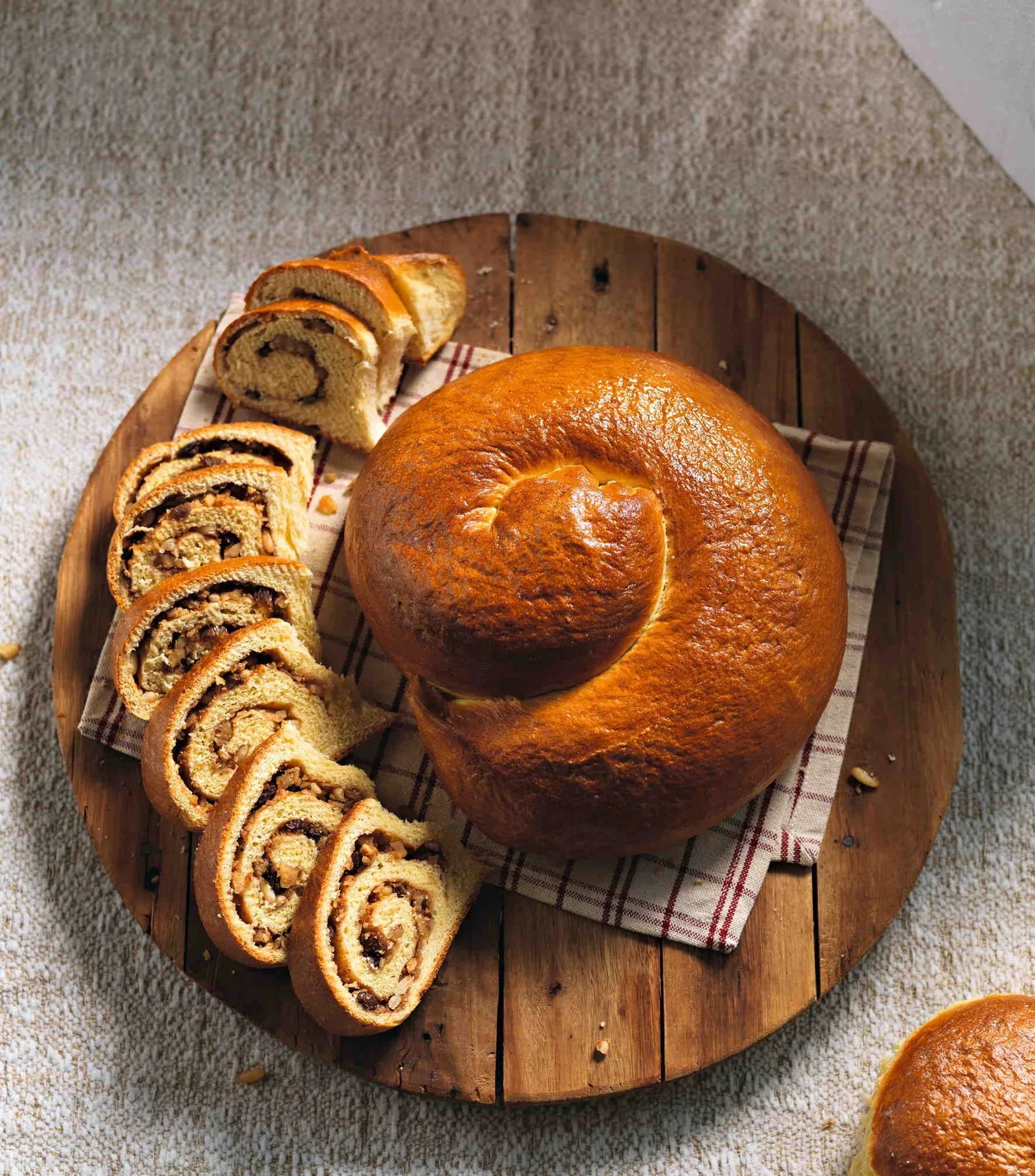 Переложите спираль на противень, застеленный бумагой для выпечки. Накройте влажным полотенцем и дайте подойти 1 час (до увеличения в объёме).