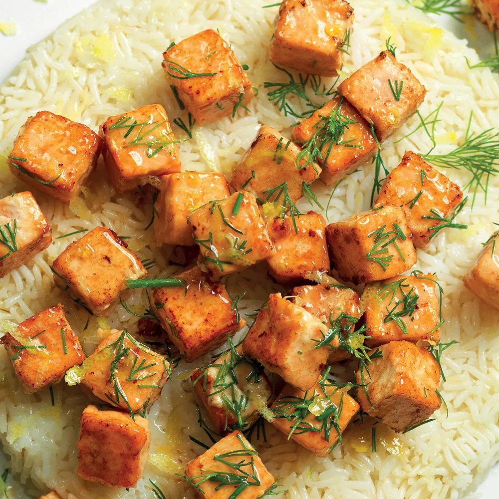Приправьте готовый рис одной столовой ложкой лимонного сока. Плотно утрамбуйте его в форму для выпечки (например, силиконовую или небольшую разъёмную). Аккуратно переверните форму на сервировочное блюдо, чтобы получилась аккуратная «башенка» из риса. Подавайте рис с приготовленным лососем, украсив дополнительной зеленью и лимонной цедрой.