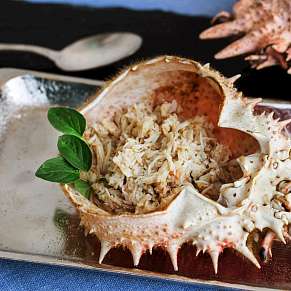 Выньте лангуста из воды, разрежьте на поливинки, извлеките мякоть, а затем нарежьте на кусочки. Разложите панцирь лангуста на сервировочном блюде, при этом голова должна опираться на кромку риса. Сам панцирь покройте кусочками мякоти, которые будут слегка накладываться один на другой.
