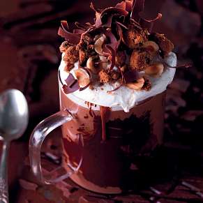 Позвольте себе заслуженное удовольствие такое, как горячий шоколад из шоколада джандуйя с цельными лесными орехами, дополненный ореховым кремом и взбитыми сливками.