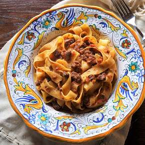 Папарделле аль чиньяле - классическое итальянское первое блюдо из региона Тоскана, представляет собой широкую плоскую пасту папарделле с сытным рагу из дикого кабана (чиньяле).