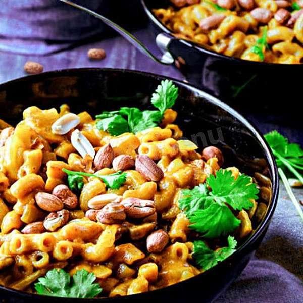 Готовые макароны подаем на стол, украсив зеленью петрушки и дополнив поджаренным арахисом.