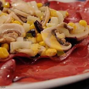 Карпаччо из брезаолы с кукурузой и шампиньонами